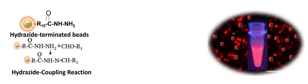 BcMag ™ 酰肼基铕荧光磁珠是在表面连接高密度酰肼官能团的时间分辨荧光(TRF)磁性微球。酰肼反应可有效的通过糖基化位点标记,固定或结合糖蛋白,糖基化位点通常(与大多数多克隆抗体一样)位于远离需要保留其功能的关键结合位点的结构域中。以这种选择性地与靶向分子Fc部分的重链结合的方式偶联抗体,有助于Fv区域末端尽可能最好地保存抗原结合活性。在pH 5至7条件下,酰肼基的载体和化合物将与氧化碳水化合物的羰基结合,从而产生腙键。