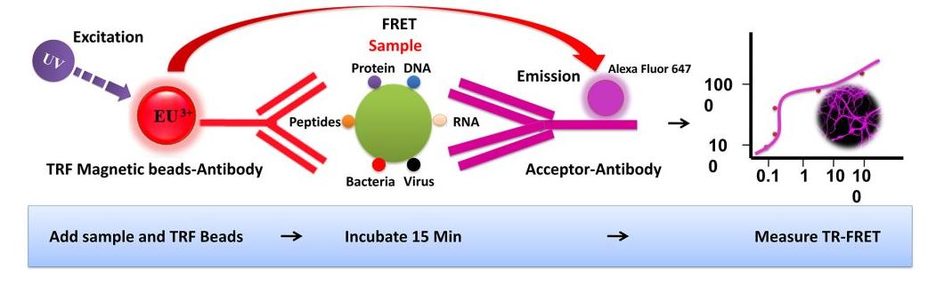 BcMag™ TR-FRET测定方法与传统的FRET(Förster共振能量转移)测定方法不同,它利用时间分辨荧光磁珠(BcMag™ TR-Magnetic Beads)作为荧光供体团。供体和受体可以是两个蛋白质、两个DNA链、抗原、抗体或配体或其它受体。在一定的时间延迟后(通常为50至100秒),当供体和受体分子靠近并以时间分辨方式进行监测时,通过荧光共振能量转移产生信号。在BcMag™ TR-FRET测定方法中,微量的分析物可以通过时间分辨磁珠轻松地从样品中富集,从而提高灵敏度。该测定方法消除了由样品和塑料微孔板引起的所有荧光背景影响,以及直接激发受体所产生的背景影响。因此,BcMag™ TR-FRET测定方法的信噪比非常高,背景值非常低。此外,该测定方法不需要清洗步骤。BcMag™ TR-FRET测定方法在高通量筛选的生物分析中具有显著的优势,如测定灵活性、可靠性、提高测定灵敏度、更高的通量和更少的假阳性/假阴性结果。